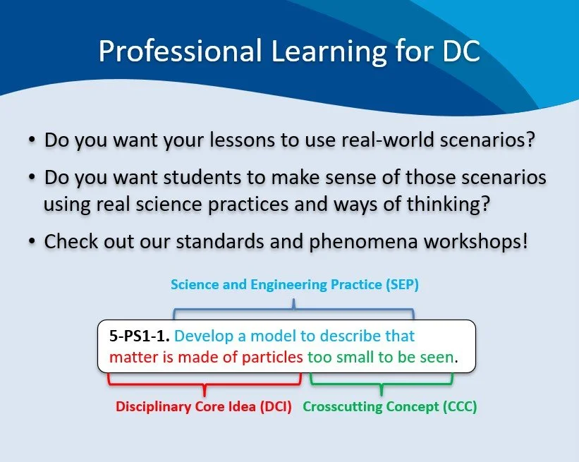 For participants in the District of Columbia, we focus on the Next Generation Science Standards and use phenomena relevant to students in the mid-Atlantic region.